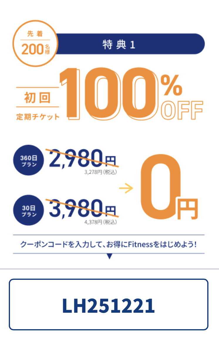 LifeFit東舞鶴店では、12月31日(水)までに会員登録していただいた方に、お得な豪華特典を用意しています。(先着200名限定)初月の1ヶ月目の費用が無料でLifeFitの利用が可能となります。
